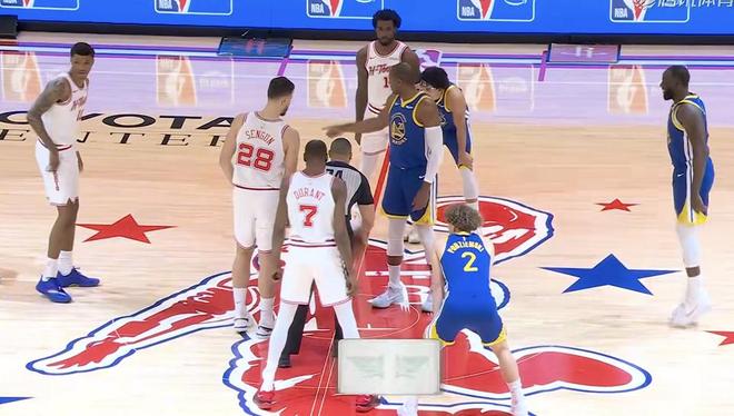 阵容方面勇士这边桑托斯、格林、霍福德、梅尔顿、波杰姆斯基搭档先发,火箭这边则是杜兰特、史密斯、申京、伊森、阿门先发五虎!