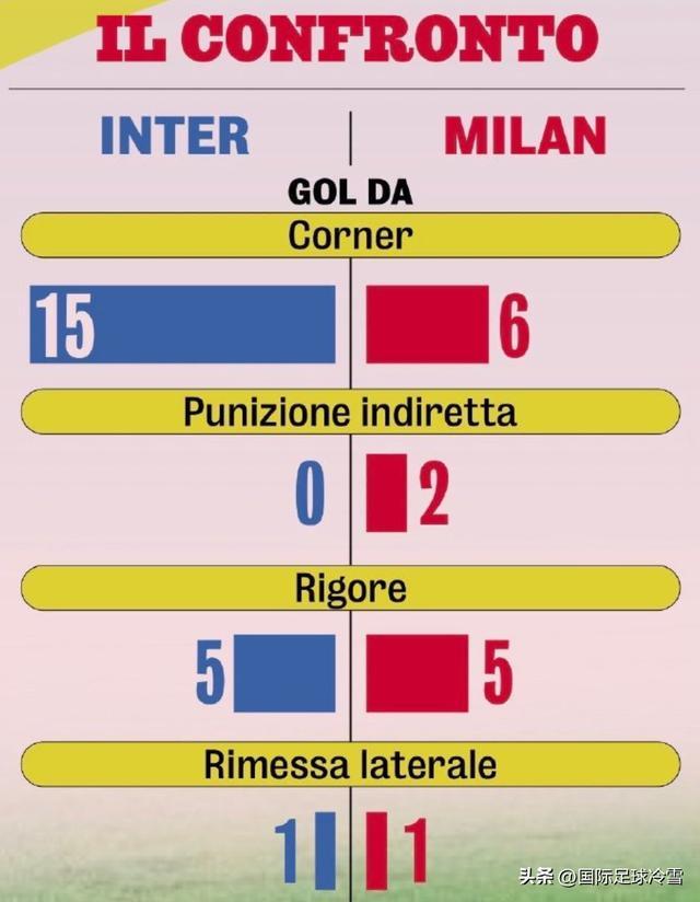比如《米兰体育报》指出,此战可能会是“定位球对决”,因为AC米兰与国际米兰都是定位球得分能力很强的球队,其中国米的角球、AC米兰的任意球,斩获数量都是意甲翘楚。